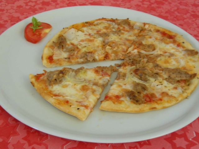 Rajčatový základ, tuňák, cibule, mozzarella, oregáno