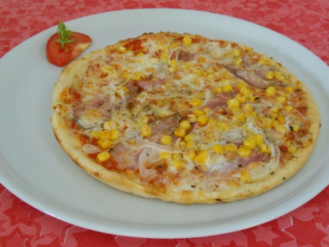 Rajčatový základ, anglická slanina, cibule, kukuřice, mozzarella, oregáno
