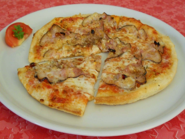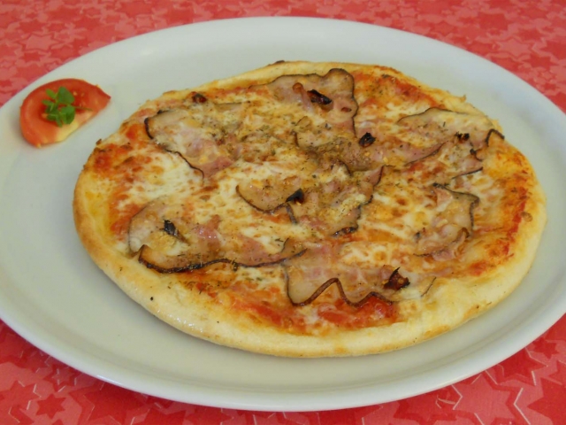 Rajčatový základ, anglická slanina, chilli, mozzarella, oregáno
