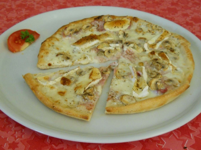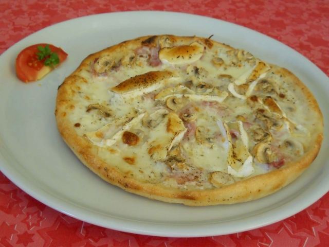 Smetanový základ, šunka, žampiony, hermelín, mozzarella, oregáno